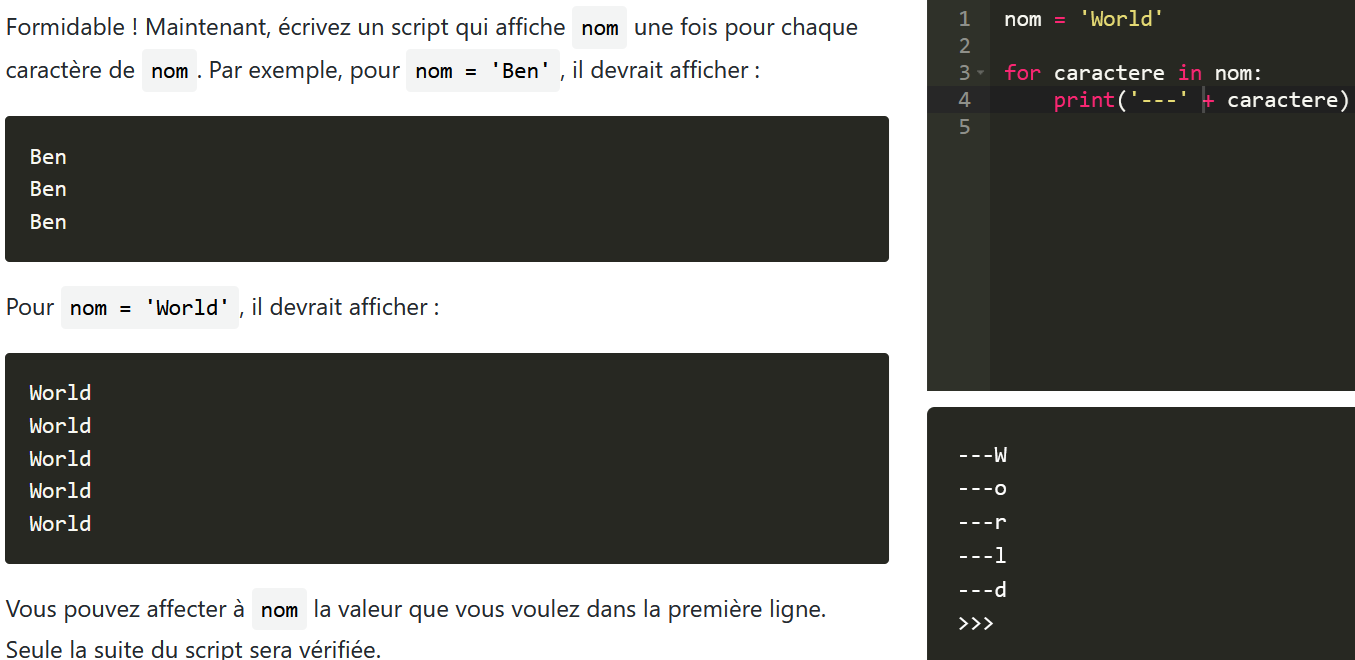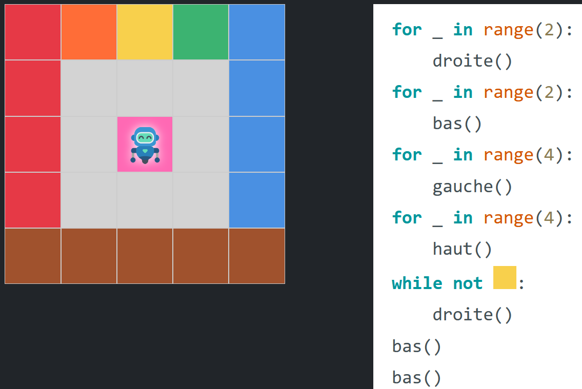 range avec différents paramètres.for.for est proportionnel au nombre de répétitions.while.for.for avec un itérable.while.En cas de difficultés persistantes sur certaines notions de ce chapitre, vous pouvez essayer de retravailler ces notions de manière ludique avec les deux sites suivant :