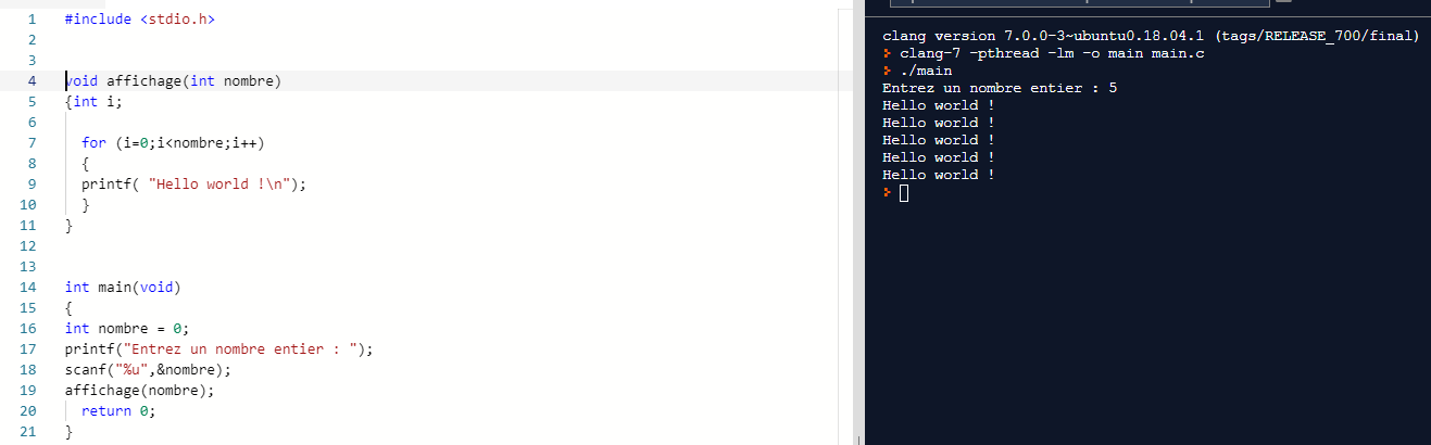n=lecture d'un nombre au clavier Pour i←1 à n afficher la phrase "Hello world"