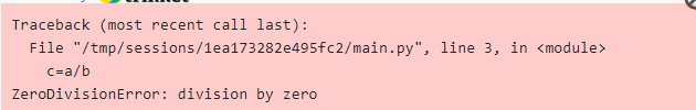 Traceback, est le début de la trace d'erreur.c=a/b.ZeroDivisionError signifie bien ici une division par zéro.Ces traces d'erreur permettent au développeur de corriger le code en comprenant où l'interpréteur à échouer à exécuter le code.