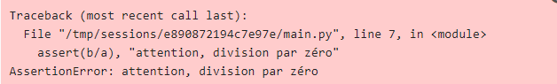 Traceback la chaîne de caractères écrites après la virgule ,, (ici "attention, division par zéro") puis arrête la lecture du programme (Ici