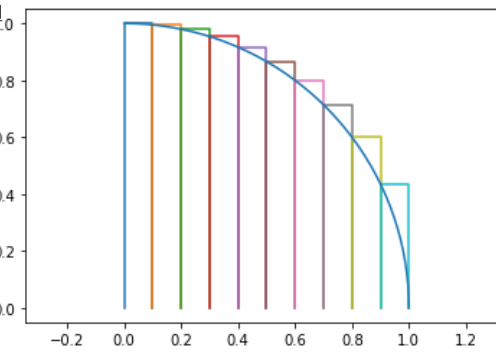 Une autre façon d'obtenir une approximation de $\pi$ est de considérer le quart du disque unité et de le découper en rectangle et d'ajouter la surface de chaque rection pour obtenir une approximation de $\pi$.